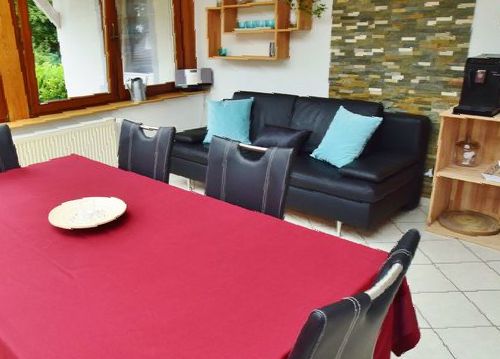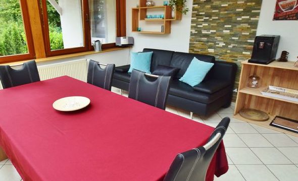 Hier haben Sie einen herrlichen Blick in unseren Garten und auf den Sonnenberg. An unserem großen Echtholz-Tisch können Sie gemütlich mit Ihrer Familie o. Freunden speisen, plaudern u. spielen. Der Kaffee-Vollautomat lädt zum Brunchen u. Kaffee-Kränzchen ein. Auf dem Echtleder-Gästesofa können Sie tagsüber ent-spannen oder es nachts zum bequemen Schlafen nutzen. Von hier aus kommen Sie über eine Treppe zur Terrasse und zum schönen Garten-Bereich, der sicher vollständig umzäunt ist.
