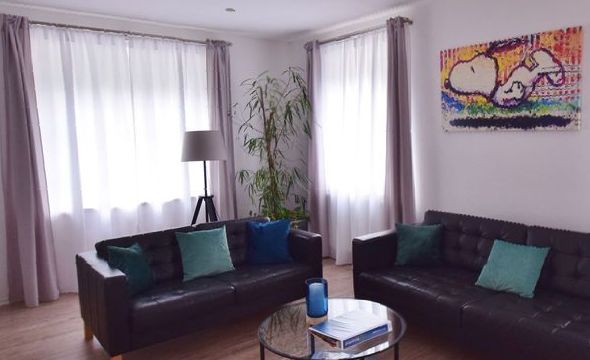 Das Wohnzimmer ist hell und freundlich gestaltet.